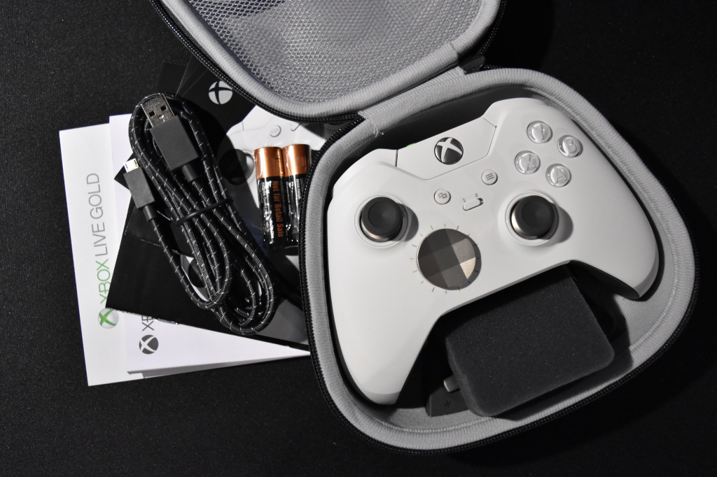 Геймпад Xbox One Elite Controller упакован в достаточно тяжеловесную коробку с изображением контроллера, внутри которой находится много макулатуры, кабель для подключения к компьютеру в тканевой оплетке, две пальчиковых батарейки Duracell, а также чехол с логотипом Xbox. Внутри чехла находится непосредственно сам Elite Controller с дополнительными стиками и, простите за оксюморон, округленной крестовиной D-pad.